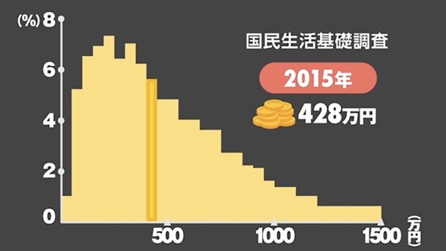 最新の2015年のデータで中央値は428万円。ピークに比べ122万円低くなっています。中間層の収入は下がり、所得の低い世帯の割合が増えているのもグラフから見えてきます。
