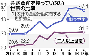 1: 2017/12/19(火) 10:35:41.51 ID:hw3vkQ5L0● BE:659060378-2BP(8000)(事務局・日銀)が十日発表した二〇一七年の「家計の金融行動に関する世論調査」によると、二人以上の世帯のうち、将来に備えた預貯金や株などの金融資産を持たない世帯の割合は31・2%(前年は30・9%)と、過去最高となった。