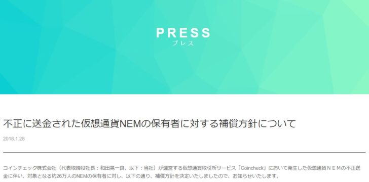 不正に送金された仮想通貨NEMの保有者に対する補償方針について | コインチェック株式会社