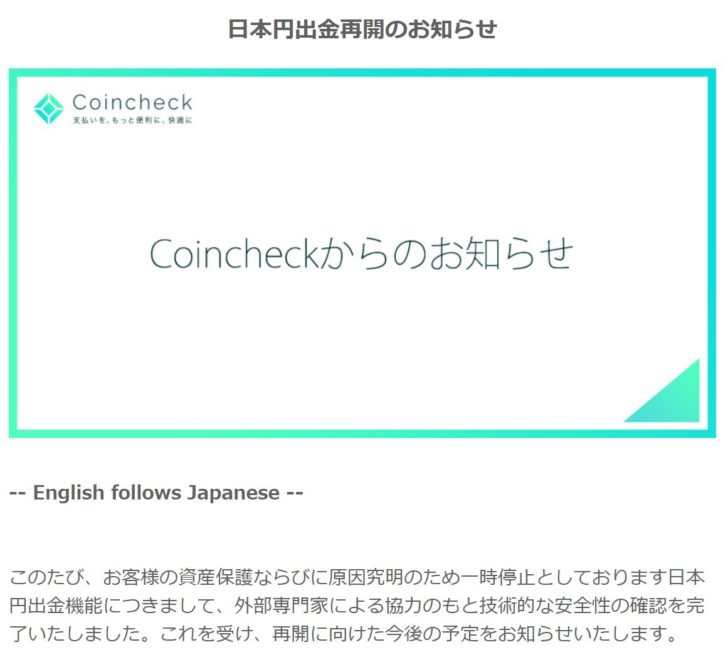 コインチェックが13日からの出金再開を予告。ただし、日本円に限る。