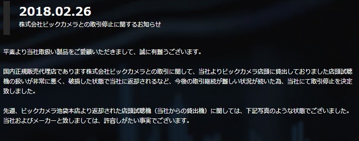 ミックスウェーブは26日、国内正規販売代理店ビックカメラとの取引停止を決定したと発表しました。ビックカメラ店頭に貸し出していた店頭試聴機の扱いが悪く破損した状態で返却されるなど、取引継続が難しい状態が続いたため、今回の取引停止決定に至ったとのこと。