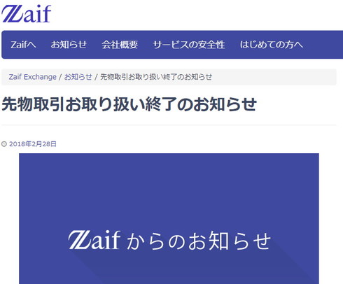 仮想通貨取引所「Zaif」を運営するテックビューロは2月28日、同取引所でのビットコインの先物取引について、3月31日をもって取り扱いを終了すると発表した。
