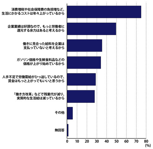 「3%では低すぎる」する理由のトップは、「生活にかかるコストは年々上がっている」。次いで「企業業績は好調で労働者に還元する余力がある」が挙がった。企業の稼ぎが働き手に十分に配分されていないことに対する不満が映し出されている。