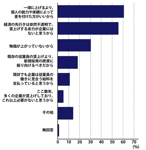 一方、「3%では高すぎる」とする理由で最も多かったのが、「一律に上げるより個人の能力や実績によって差をつけるべき」というもの。年功序列の伝統的な賃金制度ではなく成果主義的な方法を求めている。春闘のあり方にもかかわる。次いで「経済の先行きは不透明で賃上げ余力がない」だった。