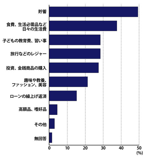 結果、最も多かった回答は「貯蓄」で49.3%を占めた。年金不安など社会保障の先行きに不透明感があることなどが理由だろう。続いて「食費、生活必需品など日々の生活費」。3位が「子供の教育費、習い事」だった。回答から見る限り、積極的に消費を増やそうという意識はあまり強くはなさそうだ。個人消費を喚起するという政府のもくろみ通りにはいきそうもない姿が浮かび上がる。