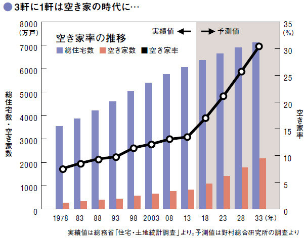 特に首都圏の郊外で育った子どもたちは都心のマンションで暮らし、実家には戻ってこない。買い手も借り手もなく資産価値は下がり、相続すらしなくなってしまう。野村総合研究所の調査によると、33年には空き家率が30%に達する。東京23区内でも、駅から距離があるような地域では大量の空き家が発生するだろう。