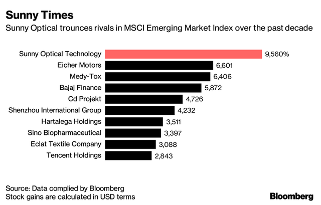 だが、中国の光学部品メーカー舜宇光学科技集団(サニー・オプティカル・テクノロジー・グループ)には、最も裕福な従業員に工場労働者や警備員、食堂の調理師までいる。同社株はこの10年でMSCIのグローバル指数のどの構成銘柄よりも急ピッチで値上がりしてきた。