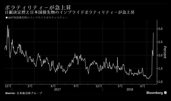 1: 2018/07/29(日) 18:43:47.04 ID:CAP_USER日本銀行が30、31日の政策決定会合で金融政策を微調整するかもしれないという考えが投資家の間に広がったために、日本国債市場が荒れ模様となり、10年物国債先物のインプライドボラティリティー(IV、予想変動率)が2016年12月以来の高水準に達した。