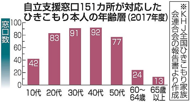 内閣府の調査(2015年)によると、15~39歳のひきこもりは推計54万1千人。10年と比べて約15万人減ったが、40歳を超えて統計上外れた人が多いとみられている。ひきこもりを始めた年齢は「35歳以上」が10・2%で倍増し、期間は「7年以上」が34・7%と最も多かった。佐賀県が昨年行った調査でも、ひきこもり644人のうち、7割を40歳以上が占めた。