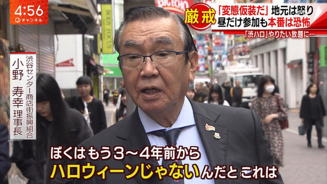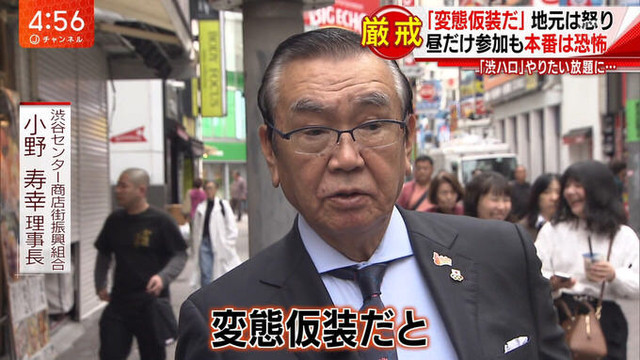 ハロウィン本番となった10月31日も、火災が起こるなど、騒動は拡大。迷惑行為も横行し、ゴミが散乱、商店街も売り上げが激減するなどしていることから、小野理事長は「ハロウィンに関しては(売り上げ増は)ないですよ。3分の1のダウンですから」と、人が多く集まっても売り上げには結びつかないと説明。そして怒りをにじませ「私たちはハロウィンではなく、変態仮装行列でもう困っている。もっとマナーを守った楽しみ方があるはず」と、過激な言葉で、ハロウィンで大暴れする人達を非難した。