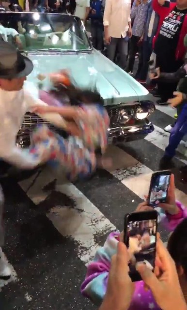 白い服の男(車の持ち主と思われる)が、無理やりボンネットから引きずり下ろした