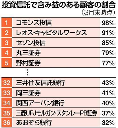 含み益のある顧客の割合はトップのコモンズ投信が98%で、ひふみ投信などを運用するレオス・キャピタルワークスが91%、セゾン投信が85%と続いた。上位3社は大手金融機関系列に属さない独立系で、毎月決まった額の投信を買ってもらう積み立て投資に注力する共通点がある。一方、あおぞら銀行や三菱UFJモルガン・スタンレーPB証券は含み益のある顧客の割合が4割を割り込んだ。