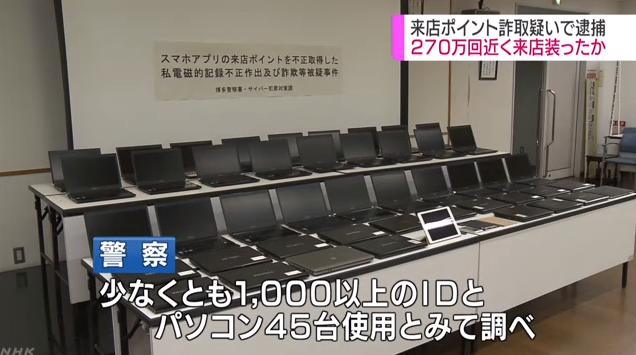 警察によりますと調べに対し容疑を認め、「ポイントで買い物をしたかった」などと供述しているということです。警察は少なくとも1000以上のIDとパソコン45台が使用されたと見て、データを解析するなどさらに調べています。