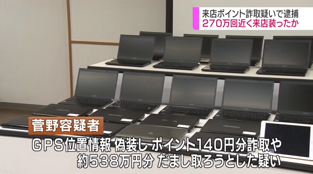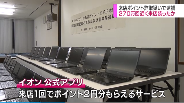 イオンに270万回来店した男が逮捕。PC45台を使用しGPS情報を偽装、1回2円の来店ポイントで約538万円騙し取ろうと画策するも失敗w