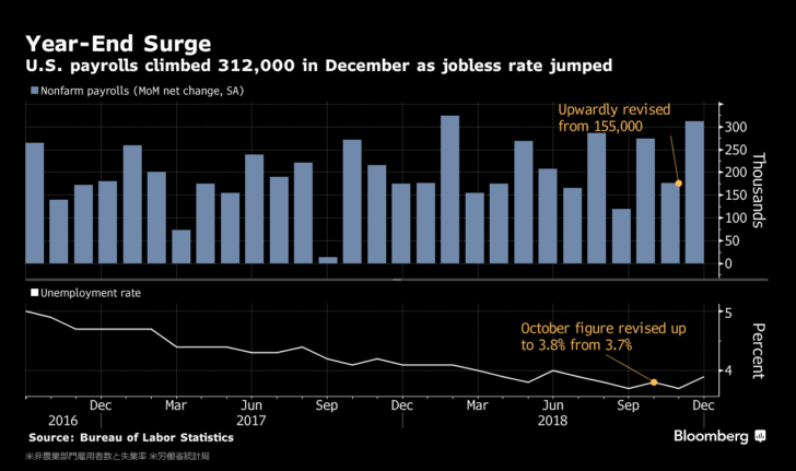 1: 2019/01/04(金) 22:58:42.77 ID:CAP_USERアメリカの景気の現状を示す重要な指標、雇用統計が発表され、12月の農業分野以外の就業者数は31万2000人の増加となり、市場の予想を大幅に上回りました。