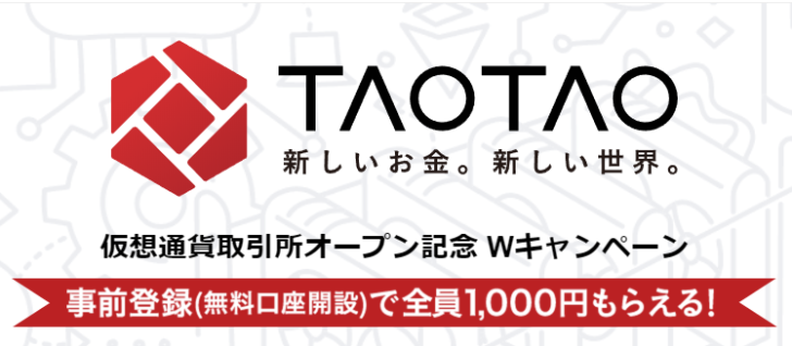 仮想通貨交換所「TAOTAO」では、取引口座の事前登録キャンペーンが実施されている。事前登録ユーザー全員に1000円がプレゼントされるほか、「TAOTAO」の営業開始後、一定条件を満たした取引を行うことにより、抽選で500名に1万円が当たる「お取引キャンペーン」に参加することができるという。事前登録キャンペーン期間は4月17日まで。
