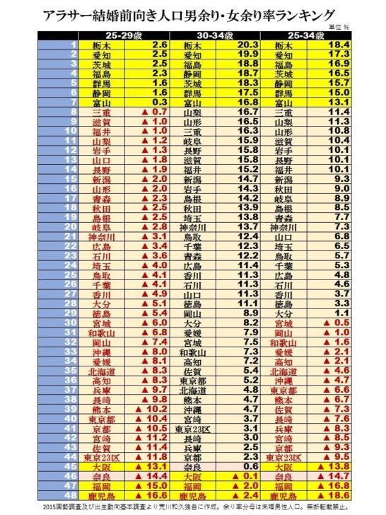 一方で、男余り率では愛知をしのぐ栃木、茨城の北関東勢は、男余りであるにもかかわらず、結婚率は女余り地区の東京・大阪と遜色ありません。