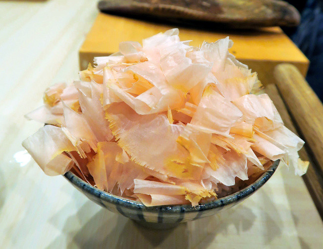 ご飯に山盛りになったかつお節は、永松さんが客の目の前で削ったばかりでふわふわ。かつお節で出しをとったみそ汁、だし巻き卵。それにおひたしとお新香がついた「かつお食堂ごはん」(1400円)が人気を集めている。