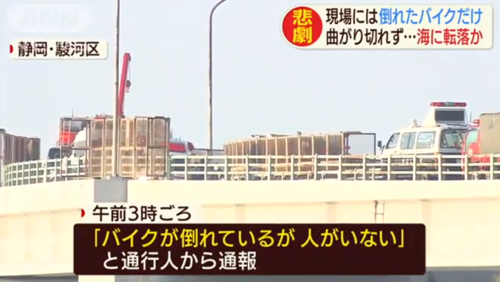 2日午前3時ごろ、静岡市駿河区の海に架かる県道の橋の上で「バイクが倒れているが人がいない」と通行人から通報がありました。現場のガードレールには追突した痕があり、倒れたバイクだけが残されていました。