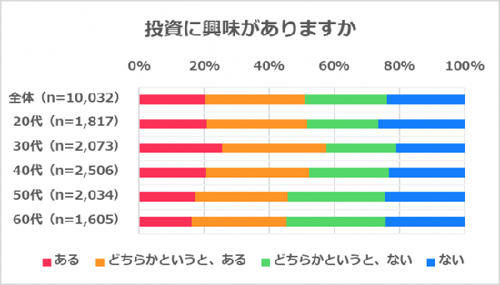 投資への興味について聞くと、50.8%の人が「ある」(ある・どちらかというとあるの合計)と回答。年代別では30代が最も投資に興味を抱いており、年齢が上がるにつれて投資に対する興味がやや薄れていく傾向があった。