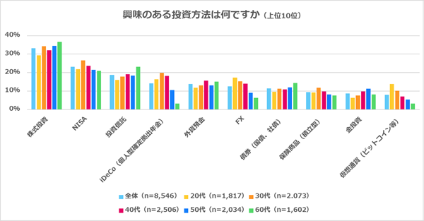 続いて、興味のある投資方法について複数選択で聞くと、「株式投資」が33.2%で最も多く、以下「NISA」23.1%、「投資信託」18.8%、「iDeCo」14.2%、「外貨預金」13.8%の順で続いた。年代別では50代から60代では「株式投資」や「投資信託」に人気がある一方で、20代から30代の若年層では「NISA」「iDeCo」「FX」「仮想通貨」などに人気があった。