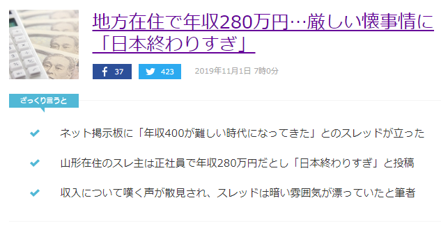 1: 2019/11/02(土) 07:18:47.20 ID:hnpeI3aE0 BE:828293379-PLT(12345)地方在住で年収280万円…厳しい懐事情に「日本終わりすぎ」