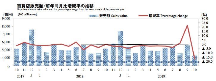 経済産業省が発表した2019年10月の商業動態統計速報によると、商業販売額は36兆5150億円(前年同月比9.1%減)となった。
