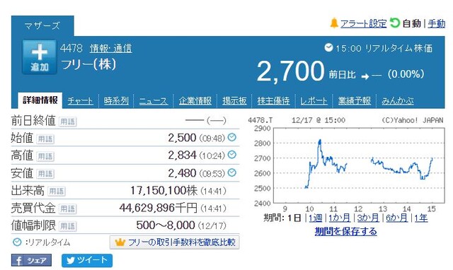 クラウド会計ソフトを提供するfreeeは12月17日、東証マザーズに上場した。午前9時の取引開始から買い注文が集まり、午前9時48分に取引が成立。公開価格(2000円)を25%上回る2500円の初値を付けた。終値は公開価格を35%上回る2700円で、終値ベースの時価総額は約1259億円。