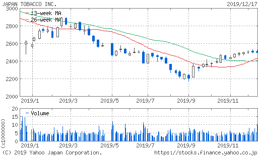 JTは短期でなく配当と優待目当てで長期ホールドしたいので2,200円くらいに堕ちたら検討します