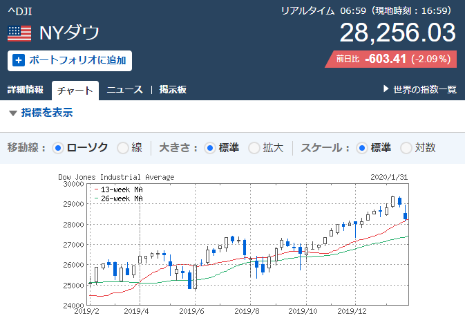 1月31日の米株式市場でダウ工業株30種平均は4日ぶりに反落し、前日比603ドル41セント(2.1%)安の2万8256ドル03セントと約1カ月ぶりの安値で終えた。下げ幅は昨年8月23日以来ほぼ半年ぶりの大きさ。新型肺炎の感染拡大で世界景気の先行き不透明感が強まった。業績が景気動向に影響されやすい資本財・資源をはじめ幅広い銘柄に売りが強まった。