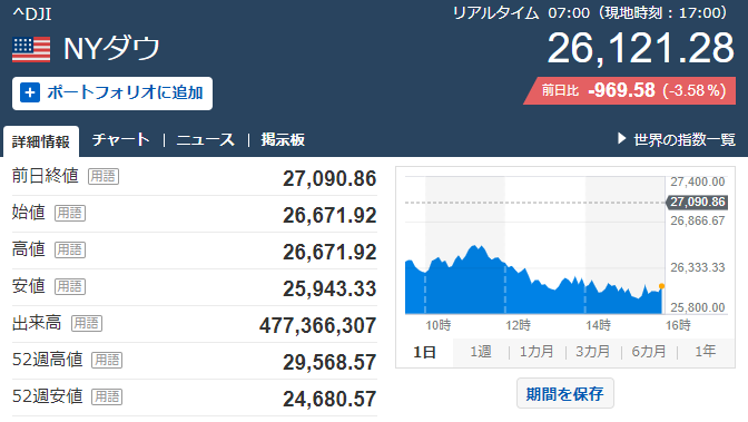 1: 2020/03/06(金) 06:27:57.78 ID:9JPIa6pt95日のニューヨーク株式市場のダウ工業株30種平均は急落し、前日比969.58ドル安の2万6121.28ドルで取引を終えた。
