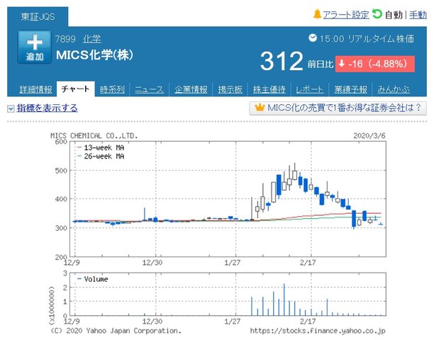 成績優秀者が購入していたMICS科学の株価チャート。新型コロナウイルスの感染拡大に伴って大きく値動きしている(=「Yahoo!ファイナンス」より)
