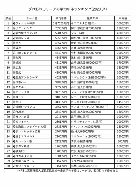 プロ野球、Jリーグ平均年俸ランキング2020