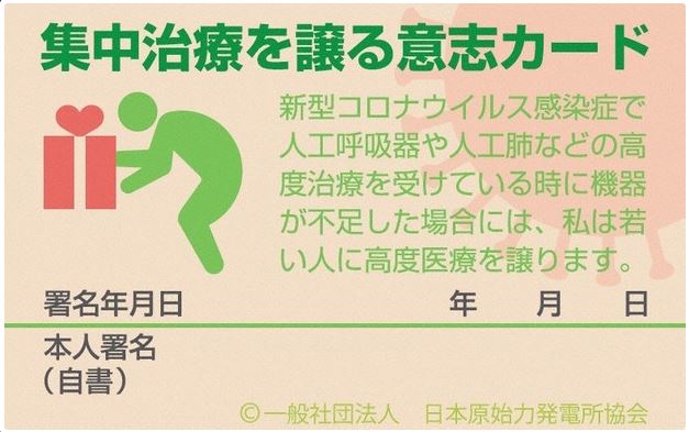 意思カードには「新型コロナウイルス感染症で人工呼吸器や人工肺などの高度治療を受けている時に機器が不足した場合には、私は若い人に高度医療を譲ります」と記載され、同意した人が署名する。
