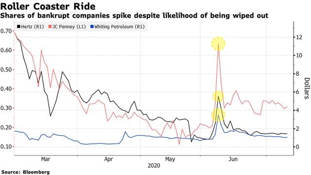 Roller Coaster Ride/Shares of bankrupt companies spike despite likelihood of being wiped out/Source:Bloomberg