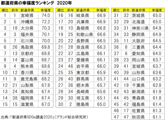 幸福度1位は宮崎県、伸び率トップは岩手県