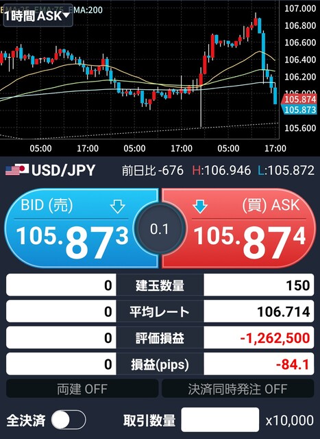 ワイ、FXでドル円106.7円150枚ロングのクソポジを掴んでしまい120万超の損失、絶望!
