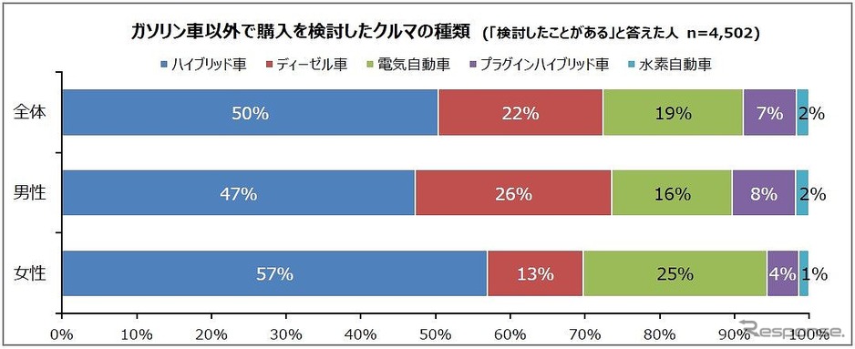 ガソリン車以外で購入を検討したことがあるクルマの種類(男女別)