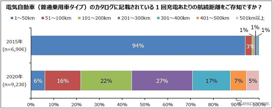 EVのカタログに記載されている1回充電あたりの航続距離については、「201~300km」が27%で最多、以降「101~200km」22%、「301~400km」17%となった。アンケート実施時に発売されているEVのカタログ記載の航続距離は「164km~570km(JC08モード)」が中心となっており、78%は実態に近い認識をしている。2015年のアンケートでは、実際の航続距離「180km~220km(アンケート実施当時)」を回答した割合はわずか2%。EVへの理解が深まっていることが伺える。