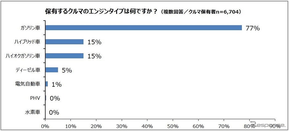 調査結果によると、保有しているクルマの種類については、「ガソリン車」が77%で最多。以降、「ハイブリッド車」「ハイオクガソリン車」が各15%、「ディーゼル車」5%で続き、「EV」は1%だった。