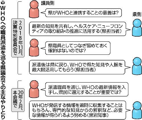 県は女性の給与負担などで計1億円超を支出してきたが、目に見える成果は乏しく、「いずれは県に戻り、WHOで得た最新の知見を還元してもらう」という計画も頓挫した。