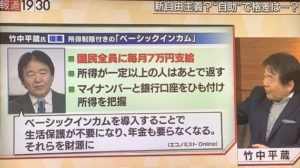 1: 2020/09/24(木) 14:06:04.50 ID:Rw+ZguWE9 元総務大臣でパソナグループ会長の竹中平蔵氏がテレビ番組で提案した「所得制限付きのベーシックインカム」が、SNSで大きな話題を集めています … 続きを読む 竹中平蔵「月七万円のベーシックインカムを提案する、生活保護と年金廃止を財源にしよう!」