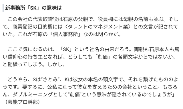 >「どうやら、Sは“さとみ”、Kは彼女の本名の頭文字で、それを繋げたもののようです。要するに、公私に亘って彼女を支えるための会社ということ。もちろん、ダブルミーニングとして“創価”という意味が隠されているのでしょうが」(芸能プロ幹部)