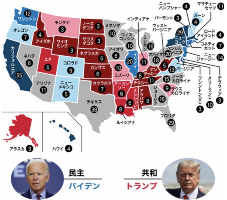 過半数の選挙人を得る候補が出なければ、2021年1月3日に招集される新たな議会で下院が新大統領を選ぶ。全米50州に1票ずつ割り当て、26票を得た候補が当選する仕組みだ。