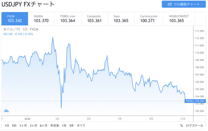 1: 2020/11/05(木) 21:39:47.79 ID:Ugs3+yfQ0● BE:323057825-PLT(13000)5日の外国為替市場で円相場は一時、1ドル=103円台後半と3月中旬以来約8カ月ぶりとなる円高・ドル安水準をつけた。