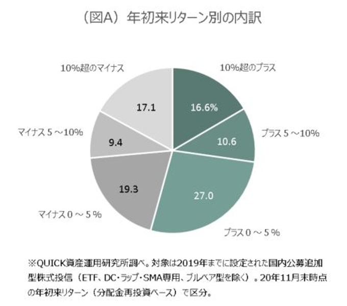 一般的な国内公募の追加型株式投信について年初来の運用成績を11月末時点でまとめたところ、プラスを確保したのは全体の約54%(図A)。残り半分近くはマイナスのリターンだった。コロナショック後の相場回復で年後半に運用環境が好転した印象が強いが、投信全体ではほぼ五分五分の結果となった。