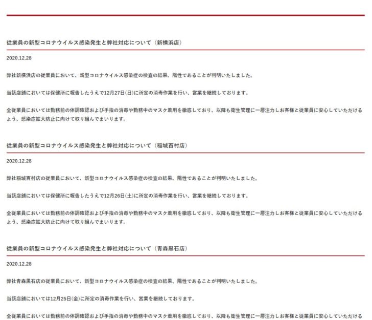 当該店舗においては保健所に報告したうえで12月27日(日)に所定の消毒作業を行い、営業を継続しております。