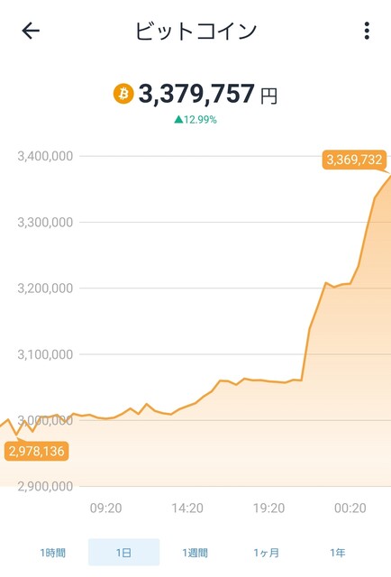 ビットコインが寝てる間に一時342万円まで高騰、雰囲気を材料に爆上がり!