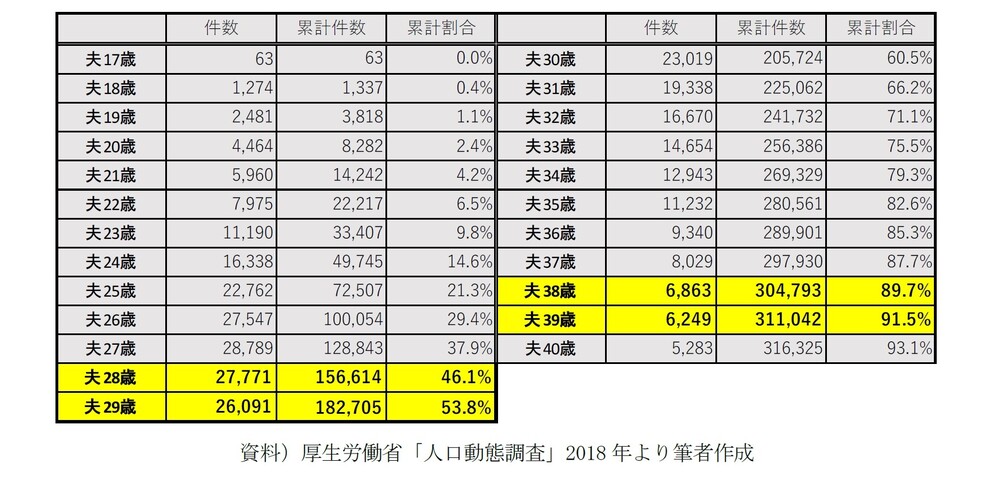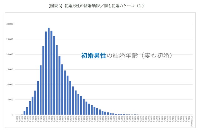 そして男女とも、ほぼ、このピーク年齢のあたりに婚姻届の件数が集中していて、そこから離れるにしたがって急激に件数が減っていくほぼ「正規分布」構造になっています。男性は27歳、女性は26歳を過ぎると成婚数ががくんと下がっていきます。
