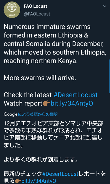 4000億匹のバッタの群れが食物を食い荒らしてるらしい